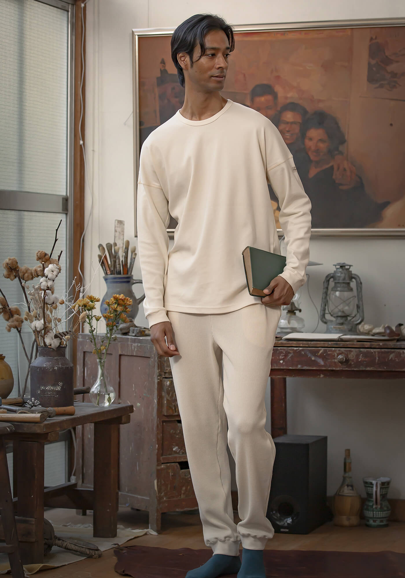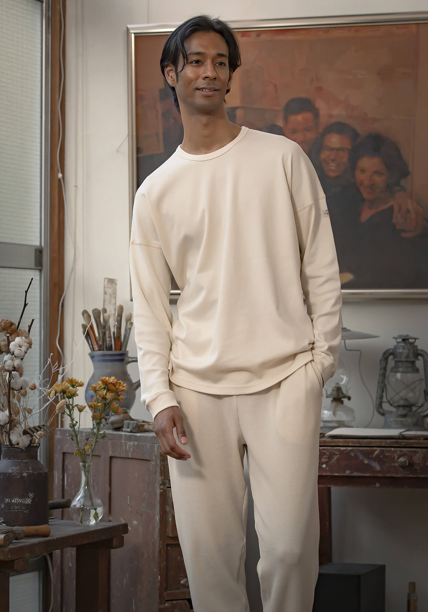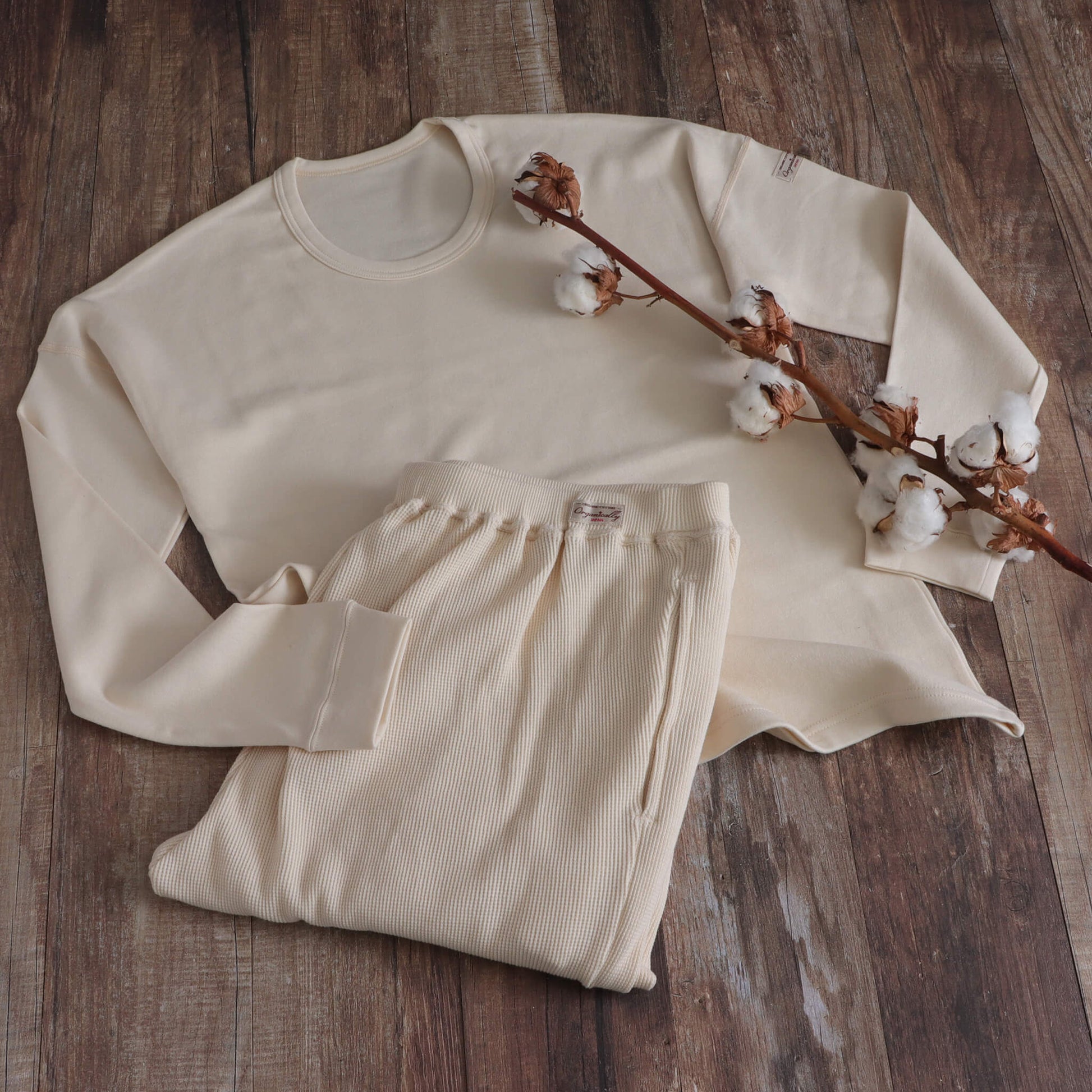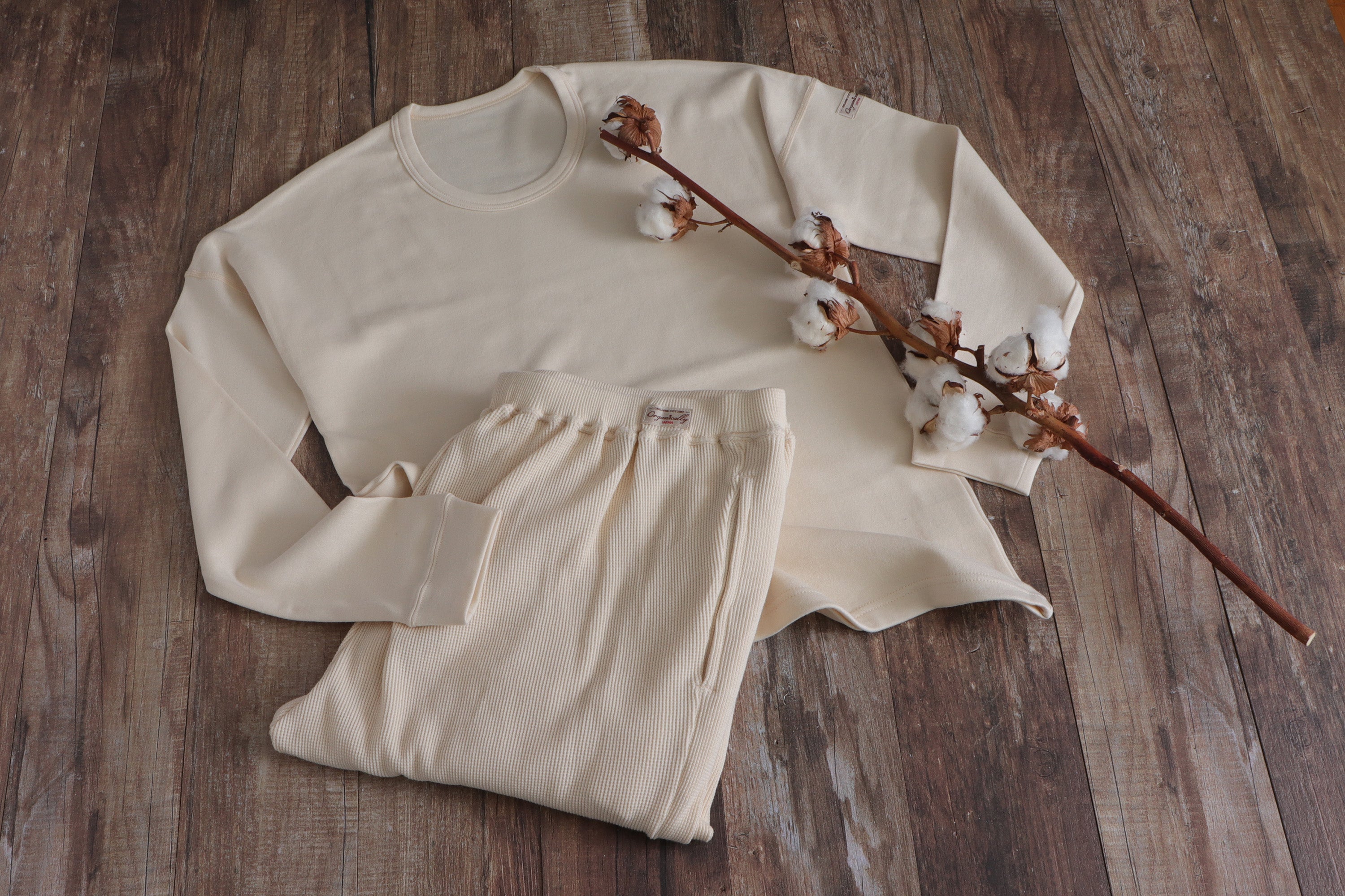 シルクのような肌触り極上の眠りへ。優しく安らげるオーガニックコットンのリラックスTシャツとワッフルパンツのセットです。