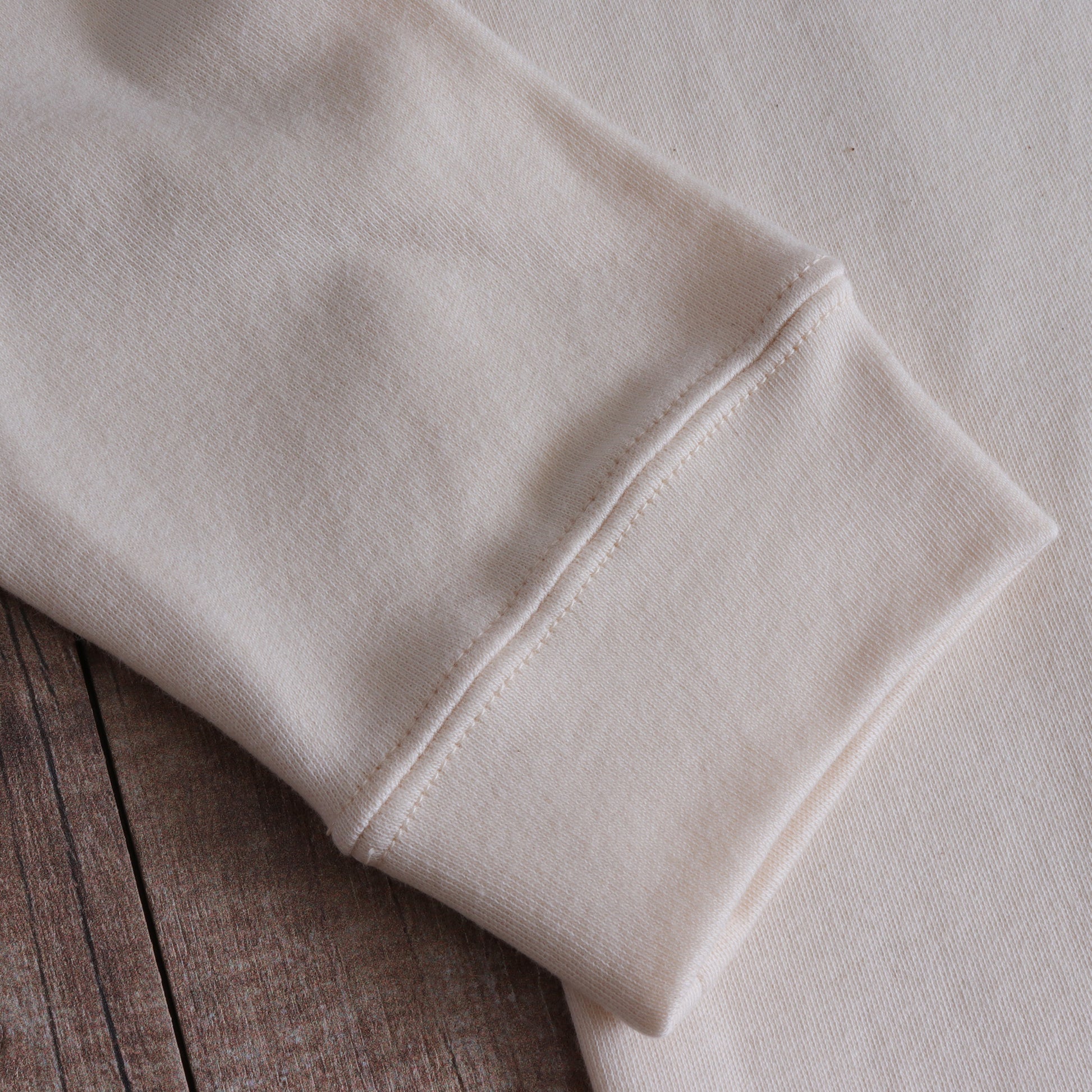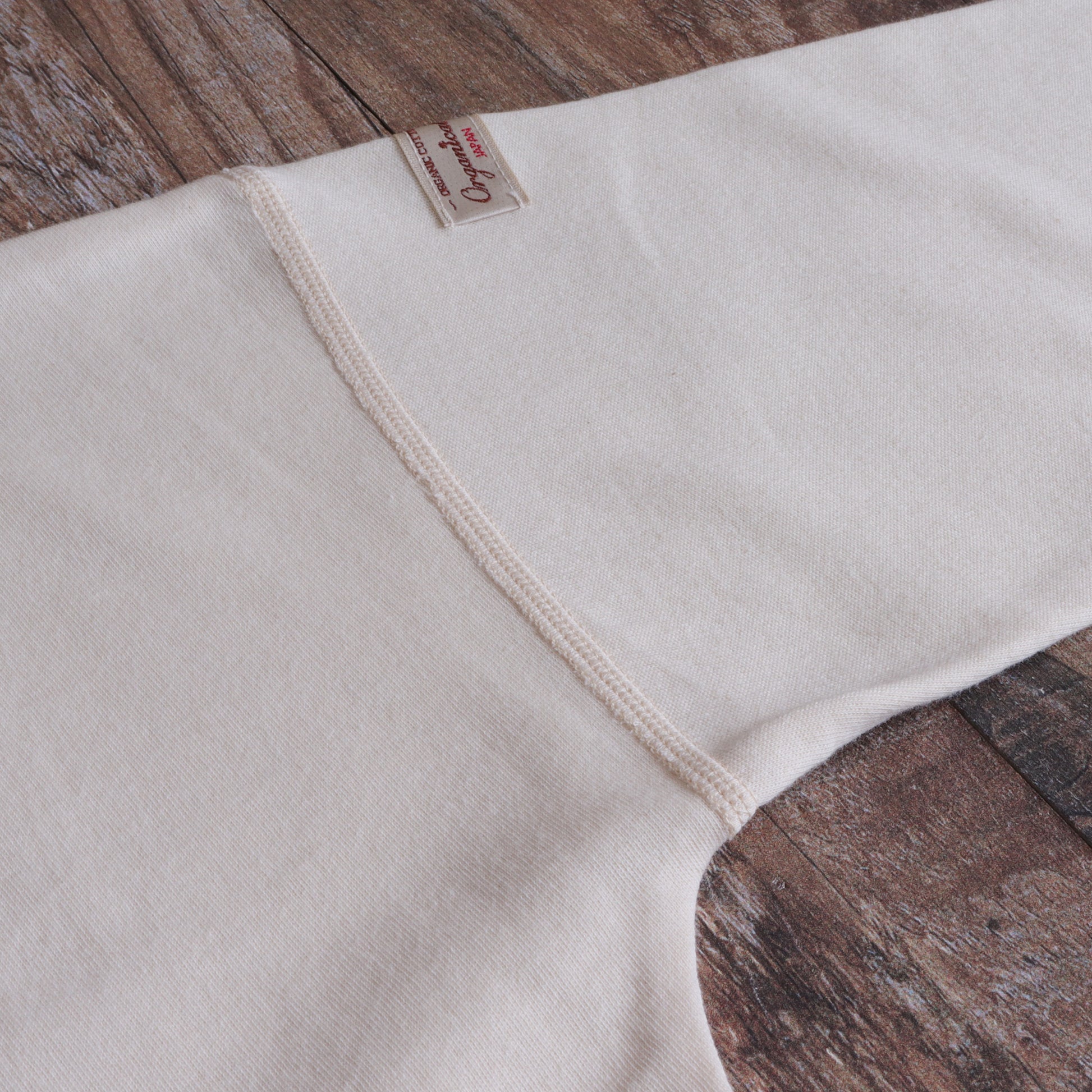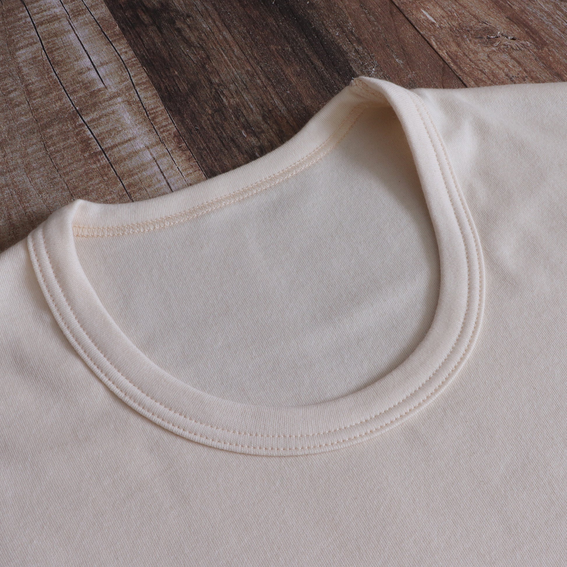 縫い糸もオーガニックコットンを使用した上、肩の伸び止めテープも共地、襟裏にはブランドネームをつけず、袖の切り替え部分はフラットシーマを採用。とにかく肌へのストレスをできる限り軽減しています。