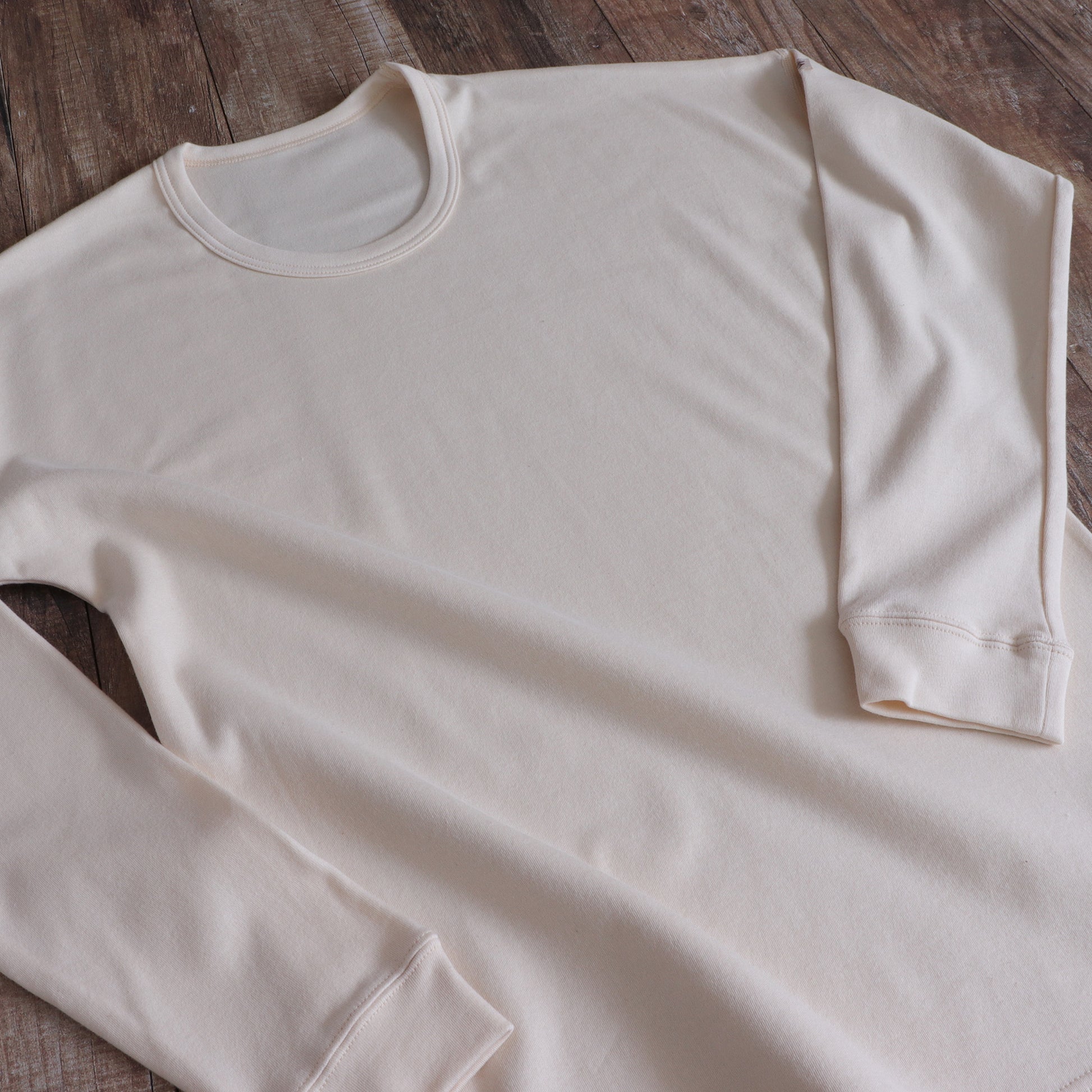 トップスはオーガニカリーの自信作、オーガニックコットンから生まれたカシミヤのような柔らかさと滑らかさが感じられる長袖のTシャツです。寝巻きや部屋着としてリラックスタイムを充実したものにしてくれます。