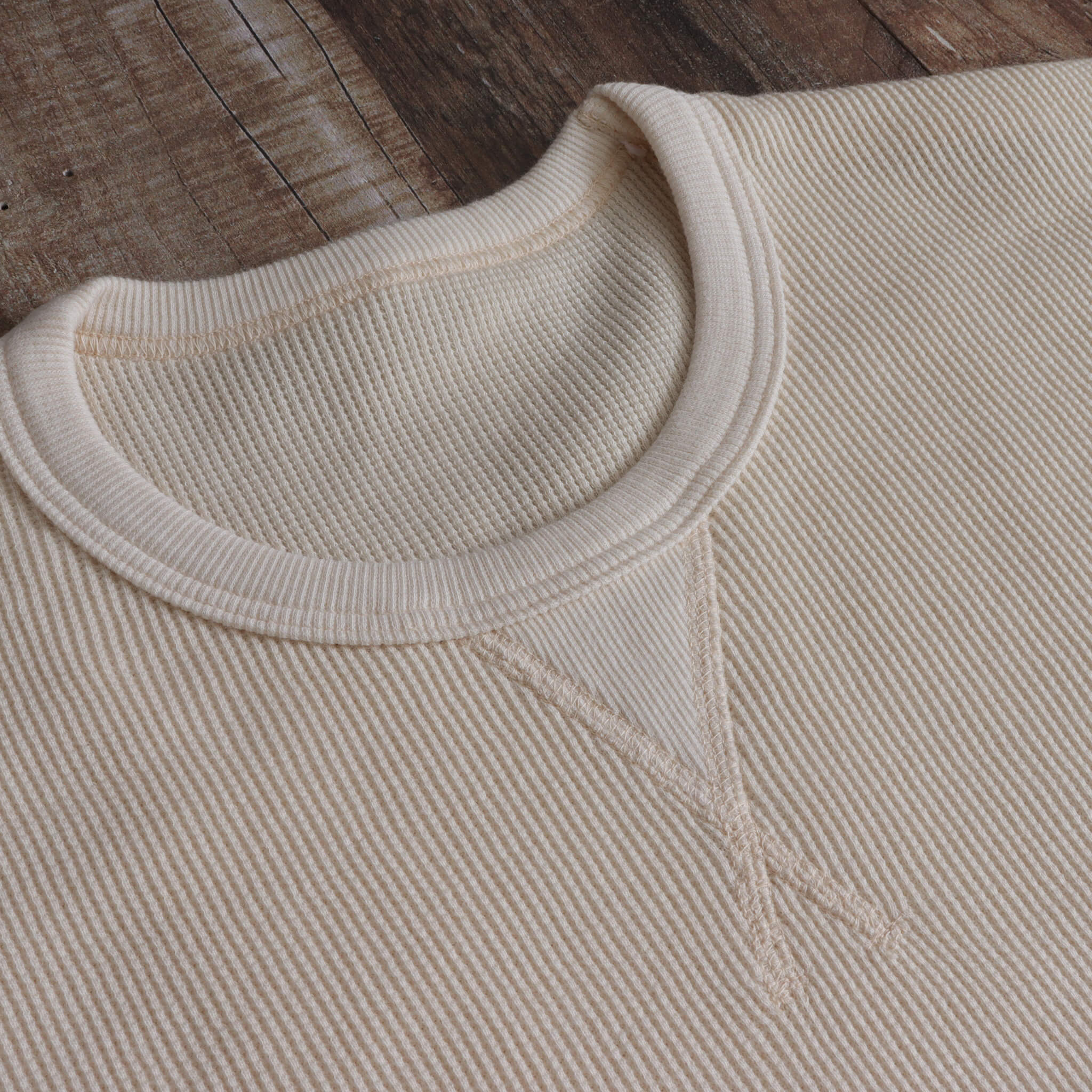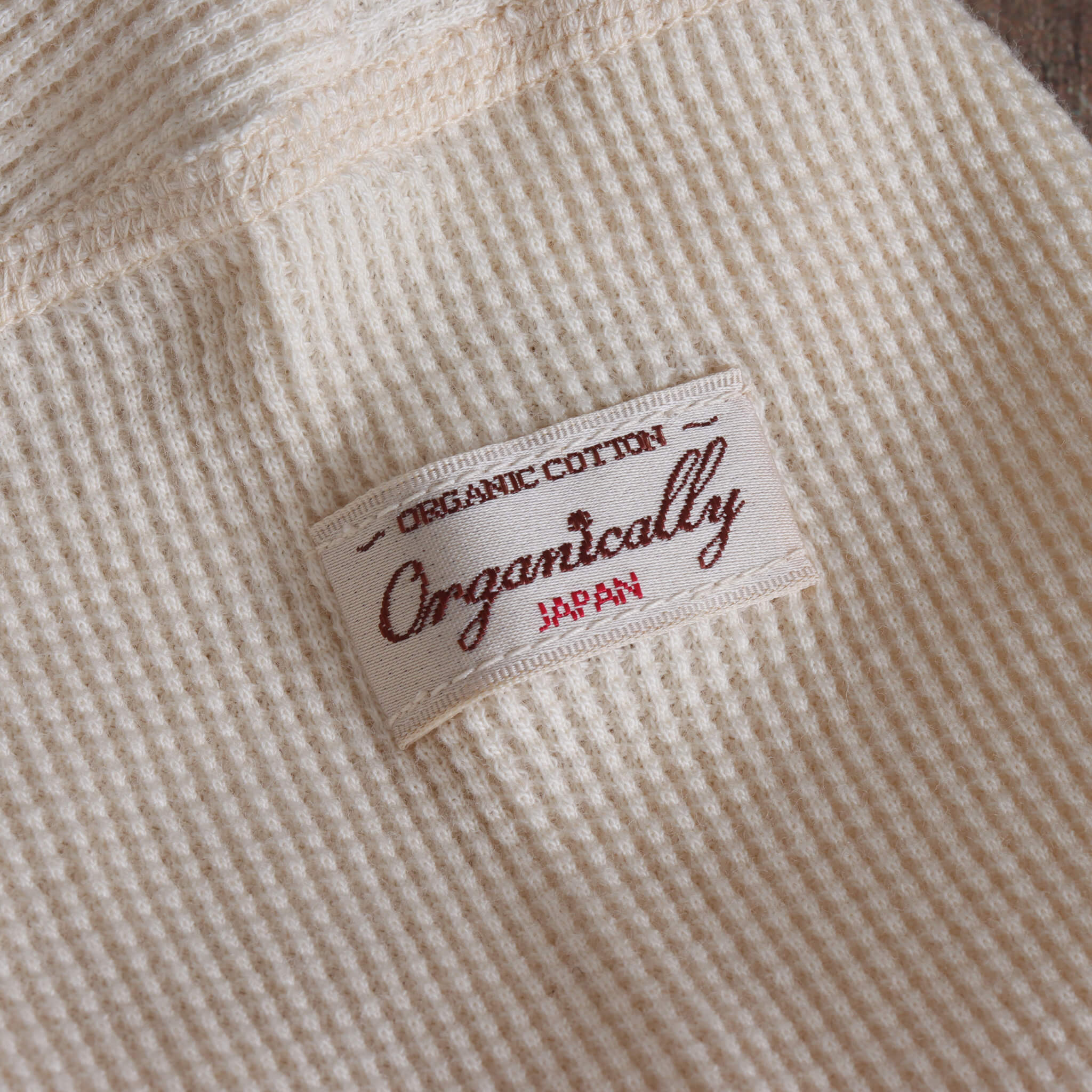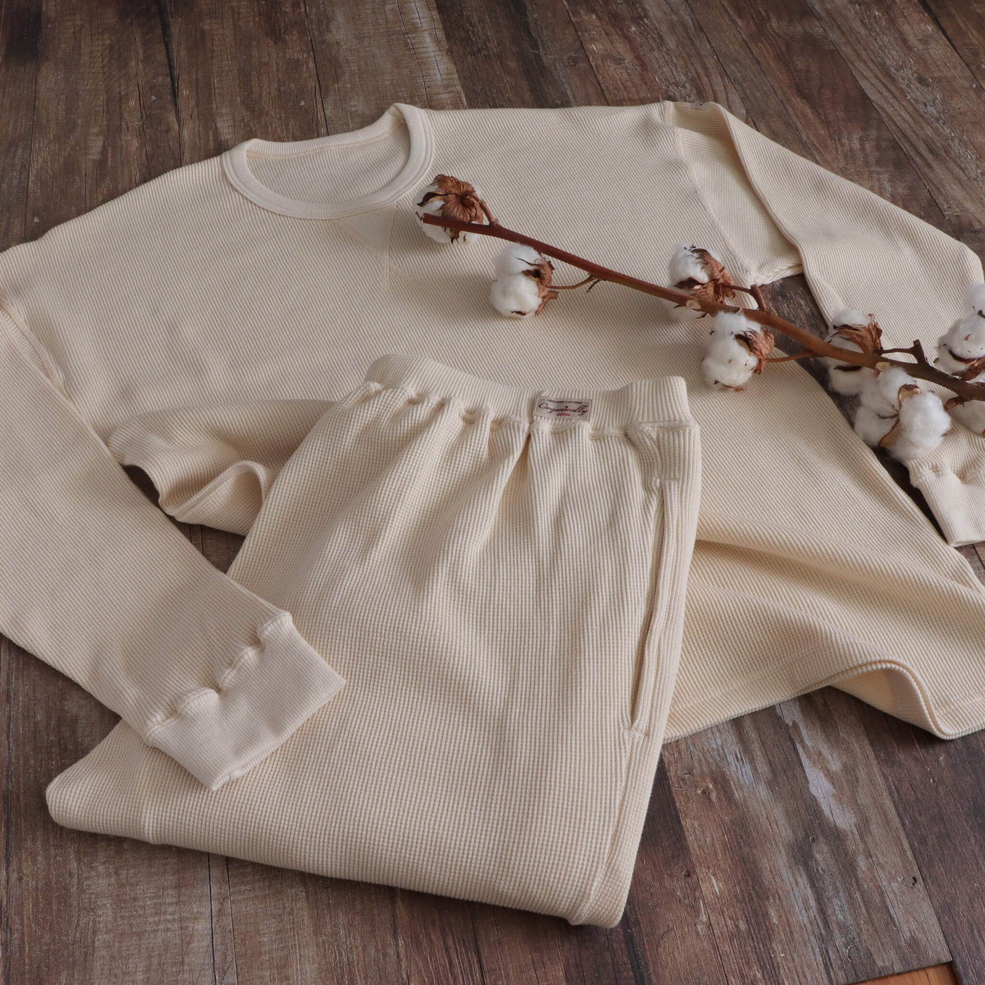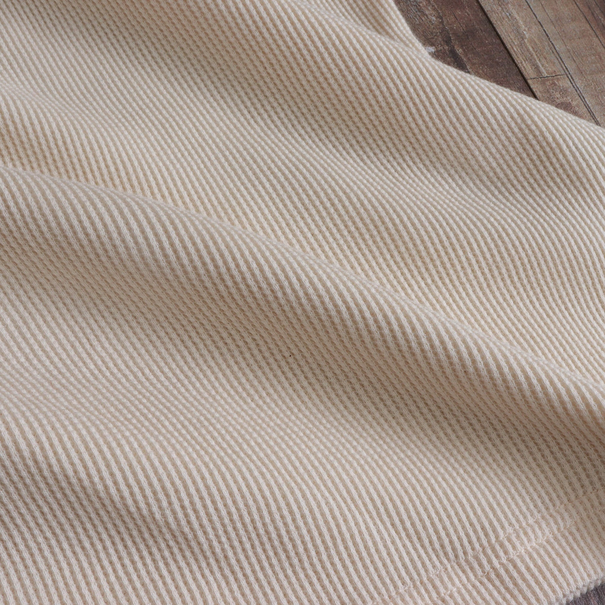 ワッフル生地は包み込むようでニットのような伸縮性もあるので、オーガニックコットンのワッフル生地はより優しく身体を包みます。また、厚みを感じますが凹凸があるため見た目以上に軽いのも良い特徴です。